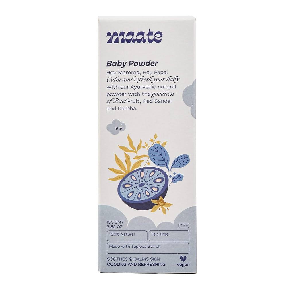 Maate Baby Powder is crafted with the goodness of cornstarch, aloe vera, and natural herbs to absorb excess moisture and keep your baby’s skin comfortable, smooth, and fresh. Unlike regular talc-based powders, it is completely talc-free, making it safer and more suitable for delicate baby skin.